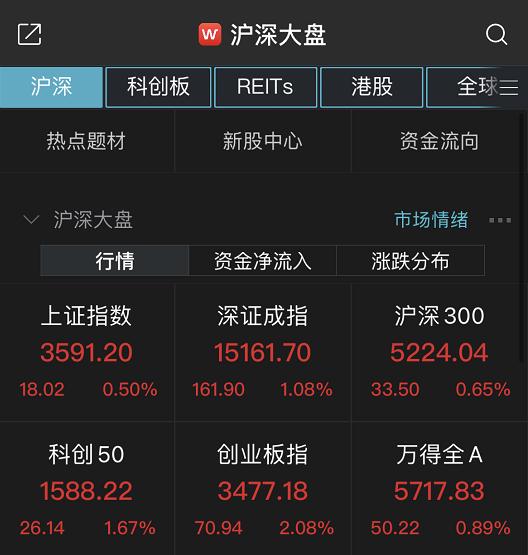 中新经纬客户端6月30日电 30日三大指数维持分化格局,创业板指走强,大涨逾2%创六年来新高。截至收盘,沪指报3591.20点,涨幅0.5%,成交额4146.98亿元;深成指报15161.70点,涨幅1.08%,成交额5277.74亿元;创业板指报3477.18点,涨幅2.08%。