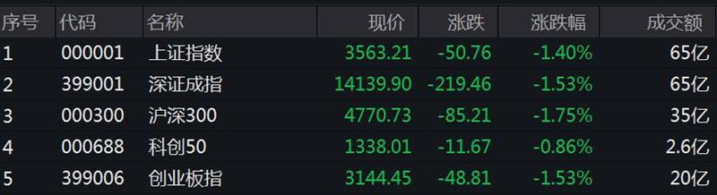 中新经纬9月22日电 中秋假期后首个交易日,三大指数集体低开。上证指数跌1.40%,报3563.21点,深证成指跌1.53%,报14139.90点,创业板指跌1.53%,报3144.45点。