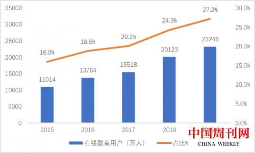 图表:2015-2019年中国在线教育用户规模及占整体网民用户比例(来源:CNNIC)