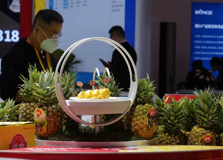 11月5日在第五届进博会食品及农产品展区拍摄的菲律宾黑钻凤梨。新华社记者 刘颖 摄