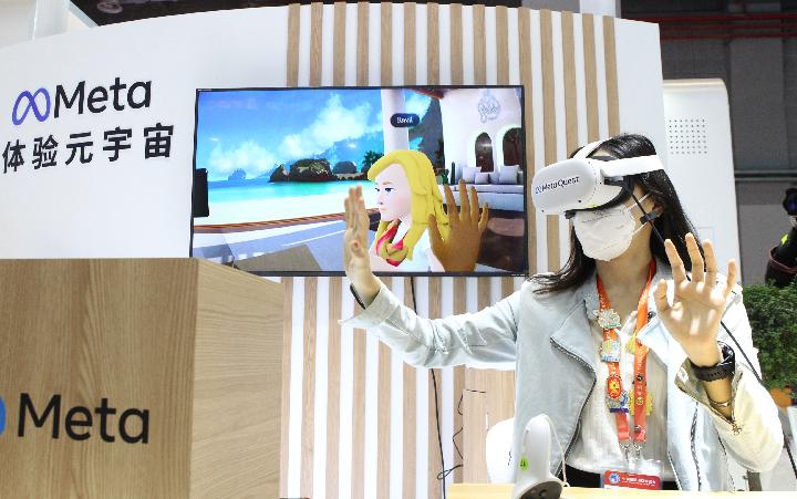 11月7日,在第五届进博会技术装备展区的人工智能专区,一名媒体工作人员借助VR头戴设备体验虚拟工作空间“元宇宙”交互应用。新华社记者 侯俊 摄