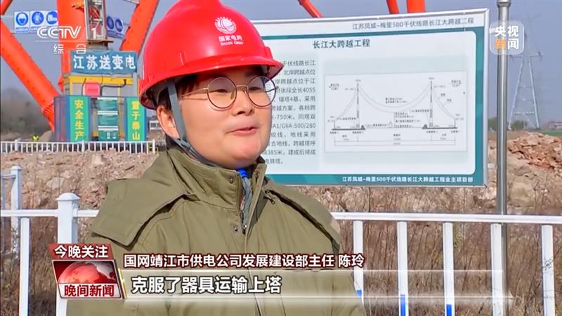 国网靖江市供电公司发展建设部主任 陈玲:(长江大跨越工程)施工过程中克服了器具运输上塔、跨江2200多米封航放线等难题,创造了杆塔高度、铁塔根开、抱杆高度和地脚螺栓重量等五个世界第一。