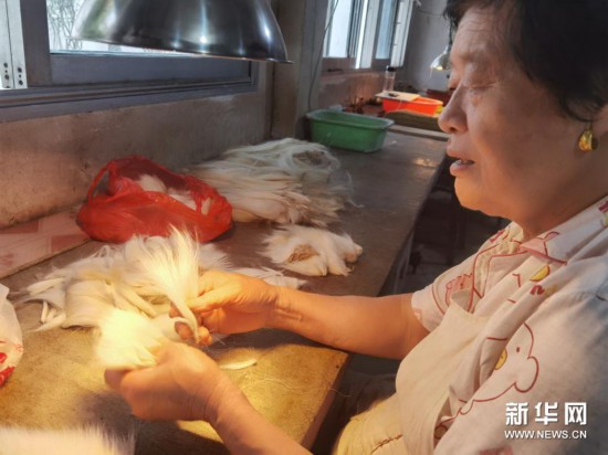 工人在安徽省宣城市宣州区溪口镇的张苏笔庄内为制笔“选毛”(9月28日摄)。新华社记者 张紫赟 摄