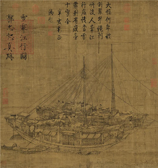 《雪霁江行图》是五代宋初的郭忠恕创作的立轴绢本设色画,现藏于台北故宫博物院。本图描绘雪霁以后两艘巨型楼船在江边行进,船的结构与船上的物件描写详尽而严谨,还穿插水手及一些人物的活动,情节生动。无数印,上方有宋徽宗赵佶题“雪霁江行图,郭忠恕真迹”10字。据考证,该图原为长卷,后被割裂,本图为原长卷中之一段。画上有宋徽宗题“雪霁江行图郭忠恕真迹”十字,上钤“御书之宝”一玺。图经宋内府及清梁清标鉴藏,《石渠宝笈续编》著录。上有“蕉林秘玩”印和清乾隆、嘉庆诸玺及乾隆题诗。