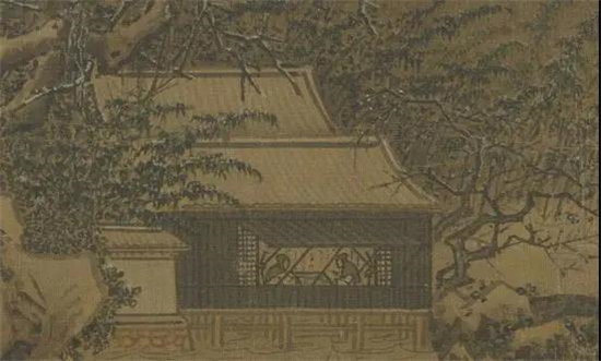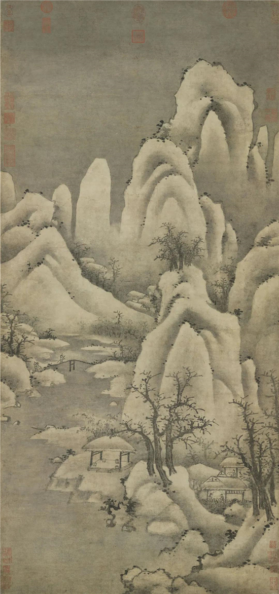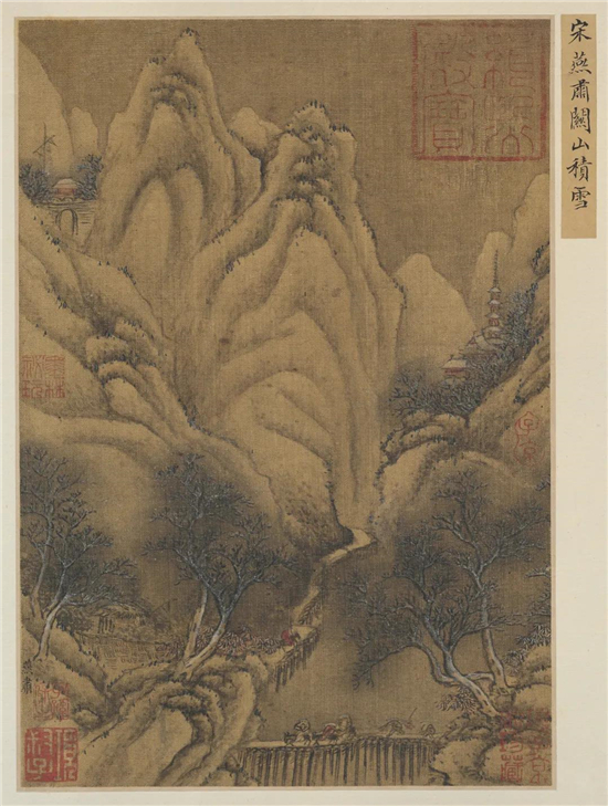 《雪山楼阁图》,现藏于波士顿美术馆。此画与《溪山行旅图》中的商旅有异曲同工之妙,左下渔夫卖鱼,山间小路上的行人冒匆匆赶路,山腰间楼阁殿宇隐现。此画皴法多是雨点皴,画中景抽绘树木,用笔遒劲,姿态各异,为画面平添生气。近处的柏树,笔法极其精彩。主峰作寒林密布,如茸似毯,密而不乱。是一幅非常优秀的宋代精品。
