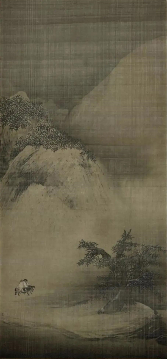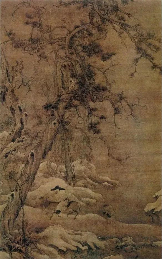 李成的《寒林骑驴图》是宋画中罕见的大立轴。画的是白雪寒冬,长松之下,一文人骑驴行于郊野,前后有童仆相随。画面只有近景和中景,远景则掩于古松之后,未着一笔,却气象萧瑟,境界幽深。在刻意营造的荒寒冷寂中,却有嫩枝环绕苍松,严寒之下仿佛孕育着无限生机。现藏于美国大都会艺术博物馆。