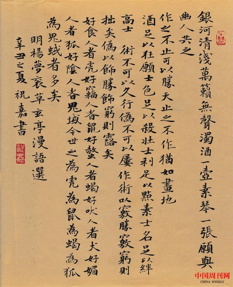 数十年的时间,对于一个书家的成长是短暂的。前面仍有很长的路要走,祝嚞能以平常心待之,能耐于寂寞,不急功近利。相信他走在书法艺术的道路上,能勇猛精进,另树新帜。