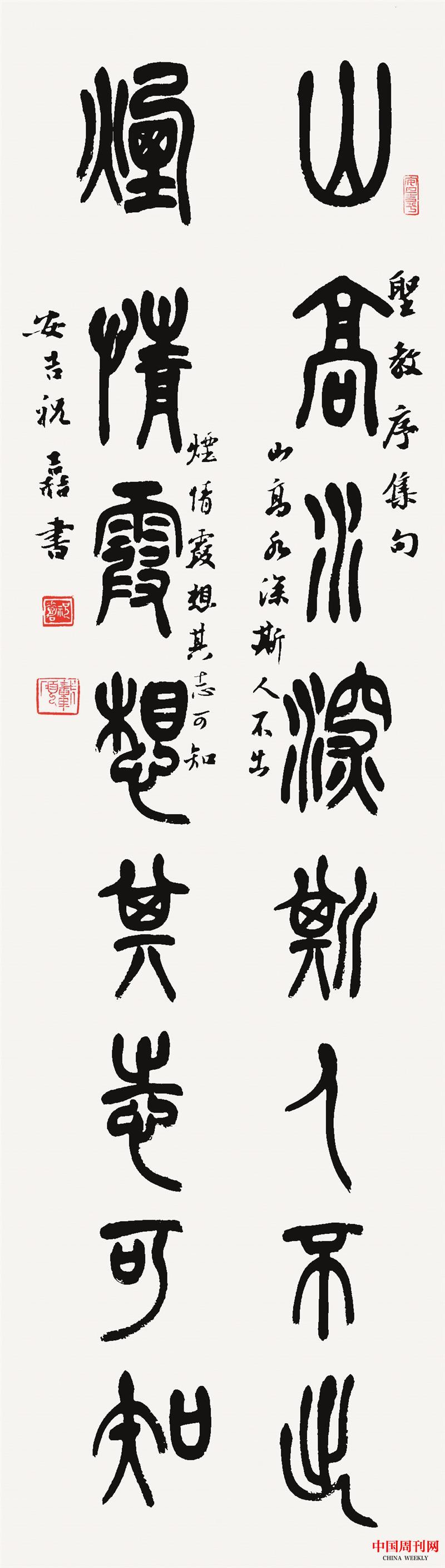 祝嚞学书由唐楷入手,亦用功于王羲之圣教序帖,继而专攻篆书。初学让翁遗法,后溯秦汉之刻石及两周鼎彝铭文,用功弥深。又喜捉刀治石,规摹秦玺汉印,甚得爽利之法。艺术无固定程序,篆书亦为书中瑰宝,师之亦何尝不可,吴昌硕毕生行于此道,竟享大名。