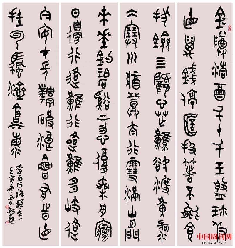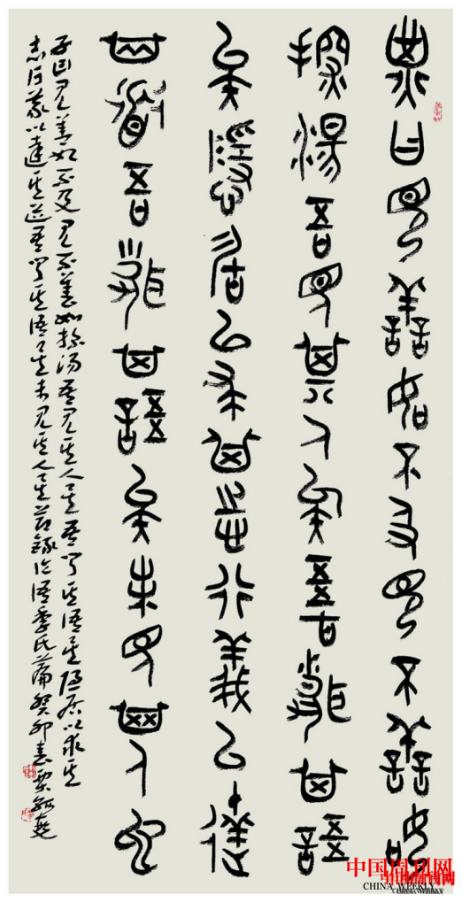 凯先生数次和我谈起贾轲敏老师及其篆书,兴奋之时眉飞色舞,赞誉之词不绝于口。我心中甚是好奇,内心也不由腾起一睹其风采的欲望。虽未曾谋面,但还是从凯先生的言谈中对贾轲敏老师隐约有了这样一个印象:行伍出身,40岁左右,有过十六年的军旅生活,清清瘦瘦,文人气质的一个男子,经常专注于古文字中的一位书法家。