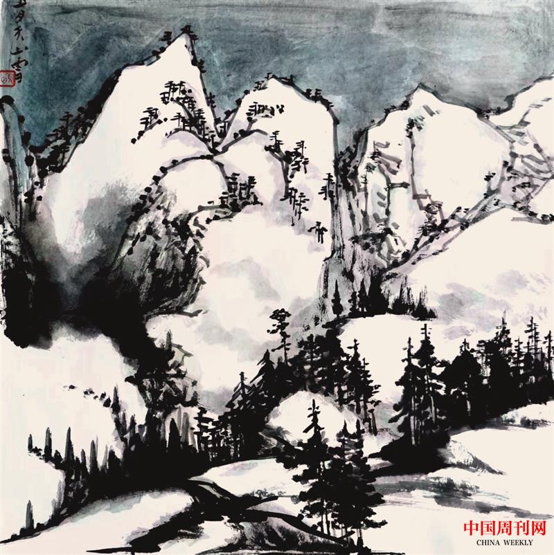 赵国庆用墨也极有焕神品质。善作墨韵,浓淡干湿焦五色交融,层层复沓。焦墨写岩崖,可以积到七层八层,或是十几层,必是积到钢打铁铸,极有苍而润的魅力。水墨调和精妙,然后擦染山之背面,提升画面的层次感,兼有去燥写润的气韵。以水为道,以墨为器,虽然是浓墨重彩,却也有色不碍墨,墨不碍色的氤氲气象,苍茫而秀逸。西北山水不仅有其骨力,也见其神采,形神兼备。这就是画法济画道的要妙,也是气韵生动唯美的原因。他的山水也是一首大漠孤烟直的浑然雄诗,以雄诗入画,可观可阅,反复品味,引人卧游。