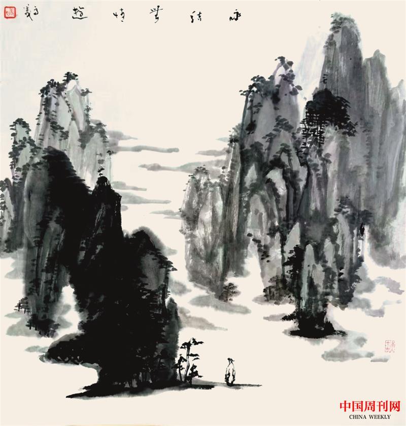 他作丹青,题材相当丰富,凡是戈壁物象皆可以入画写形神。云烟大漠,山高水长,溪山行旅,牦牛雪峰,胡杨风骨等,因为拥有丰富的视觉经验,所以撷来入画,遂心应手。生于斯,成于斯,心与大漠相通,所以大漠精神可统摄于笔墨,作最有气势的境界的表达。赵国庆的山水作品,有盛唐的大气度,也有两宋的文人气,再有明清流丽欣赏性。这些画法与画意的出现,并不是他刻意跟谁学,跟谁做的结果,而是处处尽显师造化的丰姿多神。