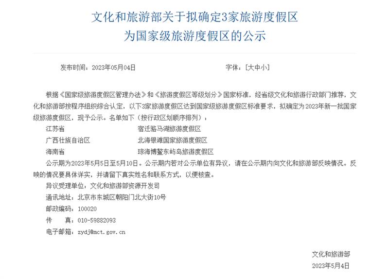 据文旅部消息,根据《国家级旅游度假区管理办法》和《旅游度假区等级划分》国家标准,经省级文化和旅游行政部门推荐,文化和旅游部按程序组织综合认定,以下3家旅游度假区达到国家级旅游度假区标准要求,拟确定为2023年新一批国家级旅游度假区,现予公示。名单如下(按行政区划顺序排列):
