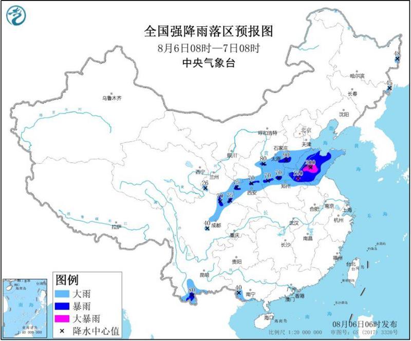预计,8月6日08时至7日08时,甘肃东南部、陕西中南部、华北南部、黄淮中北部、四川盆地西部、云南南部、广西南部等地的部分地区有大到暴雨,其中,河南东部、山东中西部等地局地有大暴雨(100~200毫米)。上述部分地区伴有短时强降水(最大小时降雨量30~50毫米,局地可超过70毫米),局地有雷暴大风等强对流天气。