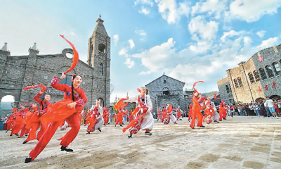 在金延安南街教堂广场前,演员们正在进行花鼓表演。