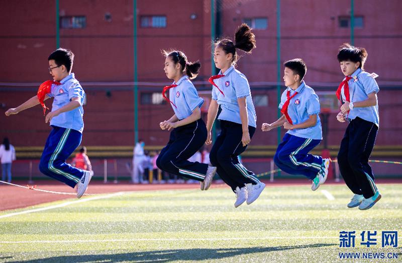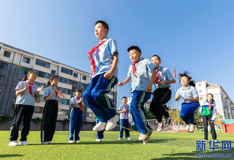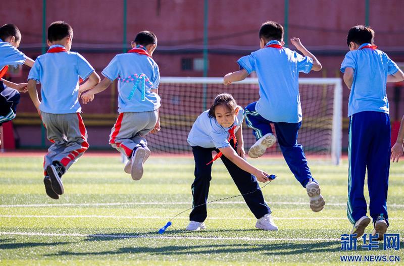 9月13日,内蒙古呼和浩特市玉泉区通顺街小学学生课后在操场上进行趣味跳绳比赛。新华网发(丁根厚 摄)