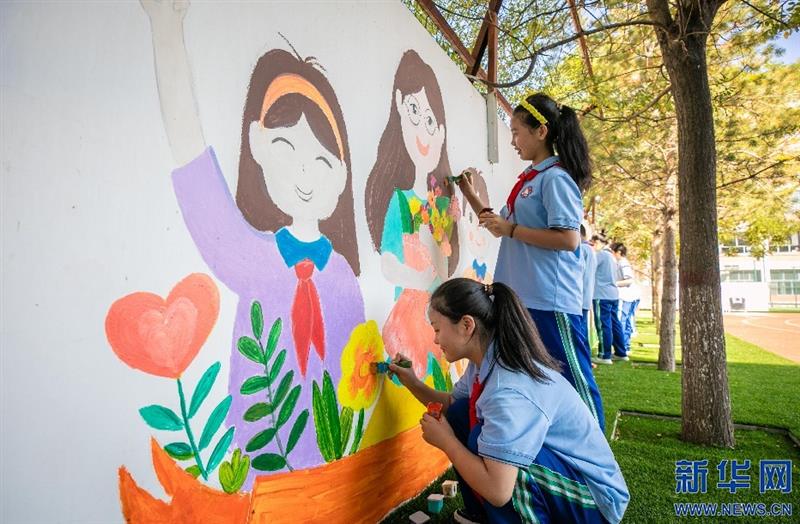 9月13日,内蒙古呼和浩特市玉泉区通顺街小学学生课后在校园内绘制墙画。新华网发(丁根厚 摄)