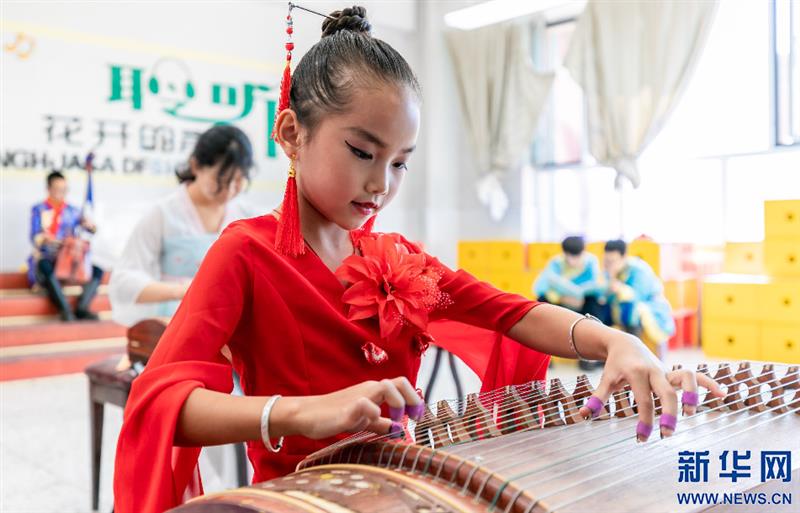 9月13日,内蒙古呼和浩特市玉泉区通顺街小学学生课后在活动室学习古筝演奏。新华网发(丁根厚 摄)