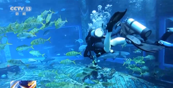 在水族馆里体验潜水的游客