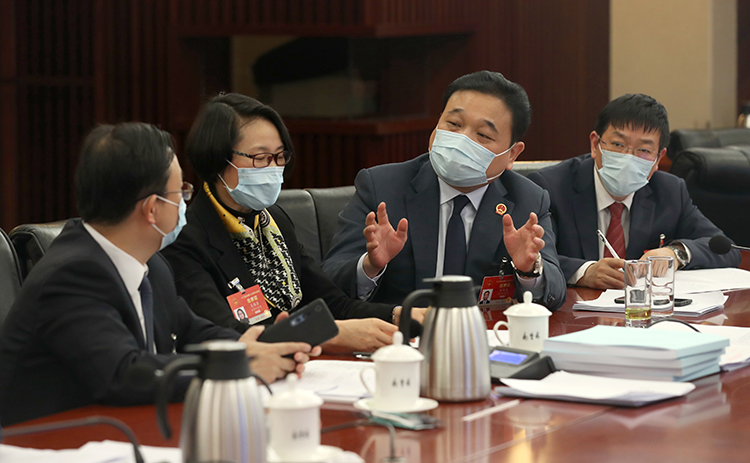 2021年全国两会期间,潘保春(左三)与其他代表讨论相关话题。受访者供图