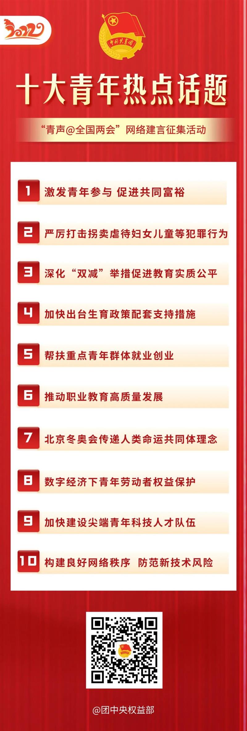 截至2月26日,累计11万名青少年参与活动,提交有效建议5040份。团团将青少年集中关切的问题进行了梳理合并,提炼出了10个青年热点话题,将速递全国两会,快来看看吧!