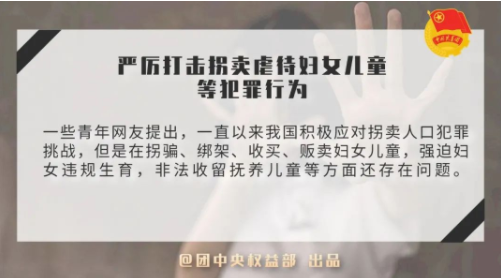 一些青年网友提出,一直以来我国积极应对拐卖人口犯罪挑战,但是在拐骗、绑架、收买、贩卖妇女儿童,强迫妇女违规生育,非法收留抚养儿童等方面还存在问题。