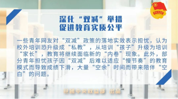 一些青年网友对“双减”政策的落地实效表示担忧,认为校外培训恐升级成“私教”,从培训“孩子”升级为培训“家长”,教育将继续面临新的“内卷”现象。此外,部分青年担忧孩子因“双减”后难以适应“慢节奏”的教育模式而导致成绩下滑,大量“空余”时间而带来陪伴“空白”的问题。