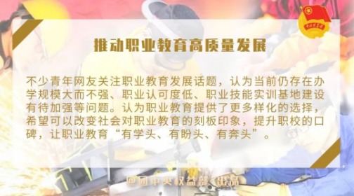 不少青年网友关注职业教育发展话题,认为当前仍存在办学规模大而不强、职业认可度低、职业技能实训基地建设有待加强等问题。认为职业教育提供了更多样化的选择,希望可以改变社会对职业教育的刻板印象,提升职校口碑,让职业教育“有学头、有盼头、有奔头”。