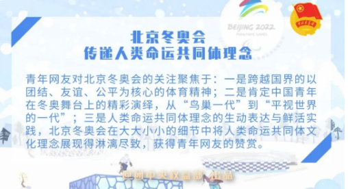 青年网友对北京冬奥会的关注聚焦于:一是跨越国界的以团结、友谊、公平为核心的体育精神;二是肯定中国青年在冬奥舞台上的精彩演绎,从“鸟巢一代”到“平视世界的一代”;三是人类命运共同体理念的生动表达与鲜活实践,北京冬奥会在大大小小的细节中将人类命运共同体文化理念展现得淋漓尽致,获得青年网友的赞赏。