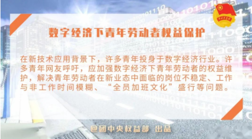 在新技术应用背景下,许多青年投身于数字经济行业。许多青年网友呼吁,应加强数字经济下青年劳动者的权益维护,解决青年劳动者在新业态中面临的岗位不稳定、工作与非工作时间模糊、“全员加班文化”盛行等问题。