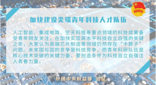 人工智能、集成电路、空天科技等重点领域的科技成果备受青年网友关注,在加快实现高水平科技自立自强的关键之年,大家认为高端芯片制造等领域仍然存在“卡脖子”问题。未来国与国的竞争是科技竞争,而青年科研队伍是核心技术突破的关键力量,要创造条件为科技自立自强注入青春力量。