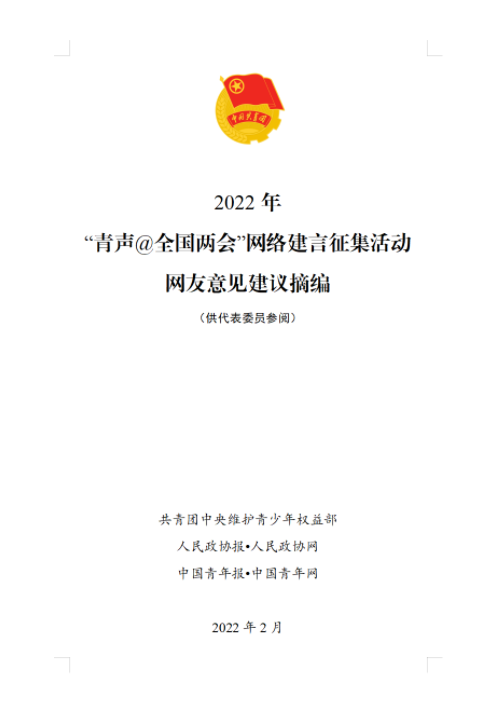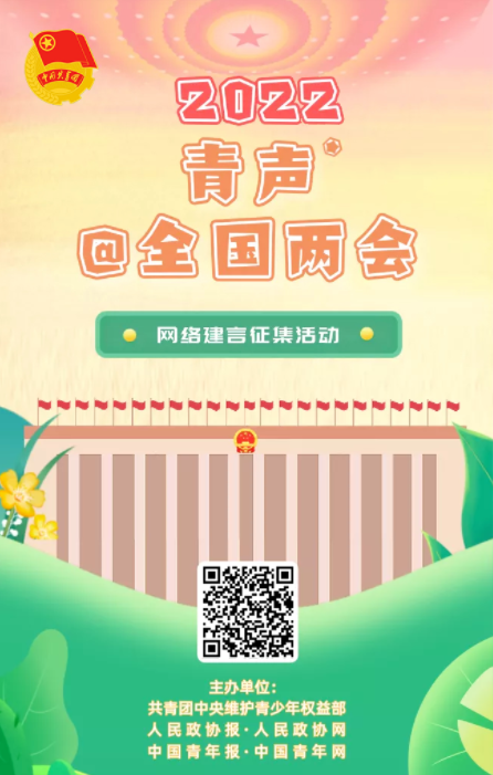 2022年2月11日,团中央维护青少年权益部联合人民政协报 人民政协网、中国青年报 中国青年网开展2022年“青声@全国两会”网络建言征集活动 ,听取广大青少年的意见建议。活动秉承“发青年之声、献青年之智、聚青春之力”的宗旨,充分发挥共青团桥梁纽带作用,把青年的所思所想所愿有序反映给有关方面,把青年的真知灼见有效传递给党和政府,为促进国家经济社会发展献计助力。
