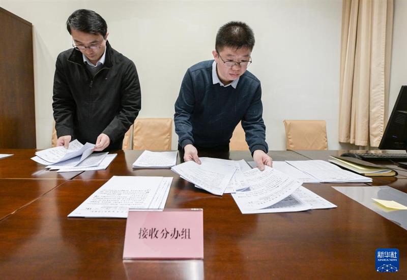 3月5日,在国务院办公厅的一间办公室内,接收分办组的工作人员整理从会场收集的意见建议材料。新华社记者 李贺 摄