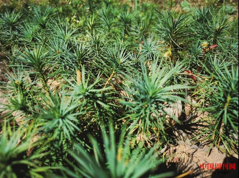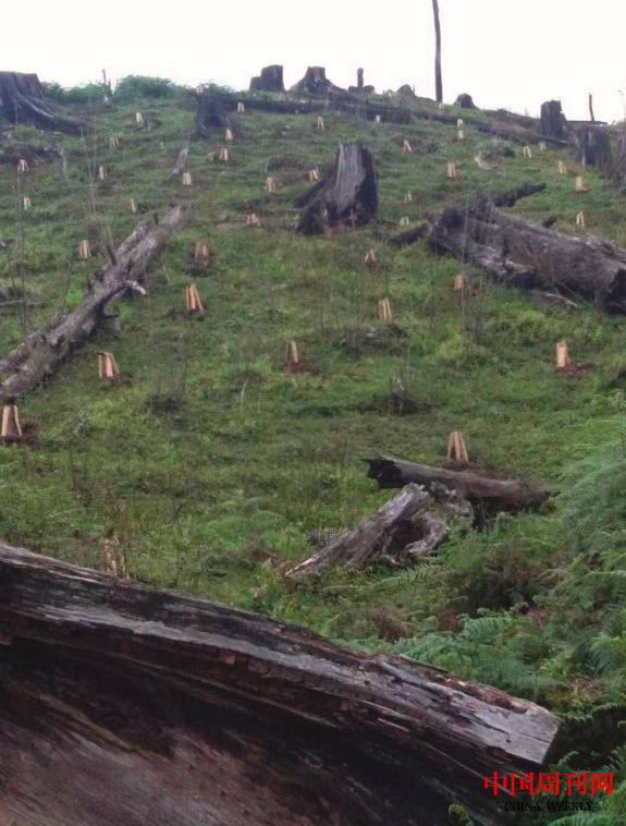 为防止新栽云杉,云冷杉树苗幼苗不被牛羊踩踏,村民在每个小苗上都围上三角小围栏
