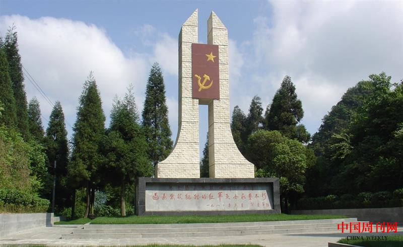 半山腰上有座红军山属于凤凰山山麓,由于建有一红军烈士纪念碑和红军红三军团的参谋长邓萍烈士墓而得名。走进陵园,沿着数百级石阶而上,一座气势雄伟,造型别致的红军烈士纪念碑映入眼帘,震撼人心。纪念碑高30米,下宽6米。碑的顶端,是5米高的镰刀锤子标志,该标志由钛合金浇铸的风铃片组成,抬头望去,标志在阳光下熠熠闪光。每逢风起,标志就会发出叮叮当当的风铃声,好似烈士英魂在耳旁细语。碑的正面,是1984年11月2日,由邓小平同志亲笔题写的“红军烈士永垂不朽”八个大字。
