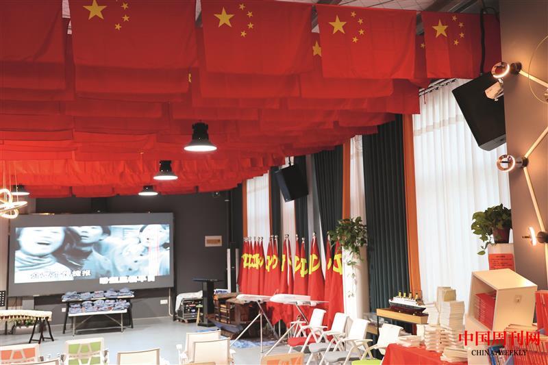 阅读空间位于科普教育基地和小广场之间,里面红色文化展示区、阅读区、科普区、咖啡厅一应俱全。阅读空间装修简朴而独特,中央大厅的天花板是毛坯的,用100面国旗和100面党旗装饰,整个大厅上方就变成了红色的海洋;对着门口的墙壁是被书架挡起来的,几个书架之间一条走道直通大厅,大厅中间是一个大屏幕,厅内几排椅子是留给大家看电影、短片用的。右侧的墙壁用20面党旗装饰,党旗下方陈列着一些革命时期的老物件,最醒目的就是按一定比例缩小的“红船”了。大厅的左侧是科普空间,VR太空舱就在这个区域,临近的空间是孩子们的阅读区,一些孩子席地而坐,聚精会神地看书。