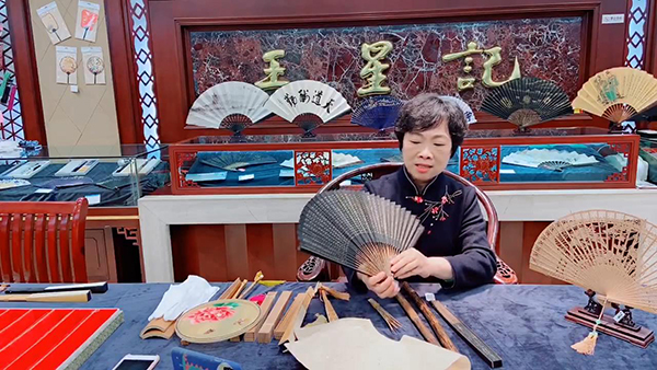 白纸扇、黑纸扇、檀香扇、玉竹扇、宫团扇、绢扇等由不同材料和工艺制成的扇品在镜头面前徐徐展开,各具特色。孙亚青大师向大家介绍了这些扇品的选料、制作工艺、艺术特色等扇艺知识。