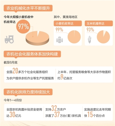 “新型农机不断升级,大大降低了粮食生产成本,提高了作物抗风险能力。”中国人民大学农业与农村发展学院教授孔祥智表示,今年上半年,在天气条件较差、病虫害严重等不利因素影响下,能够实现夏粮丰收,离不开农业基础装备的支撑。
