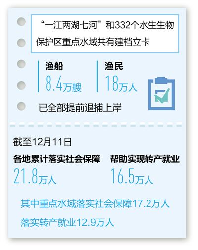 渔民安置保障稳步推进。截至12月4日,中央财政原计划安排的92亿元补助资金全部拨付到位,各地落实资金114.6亿元。截至12月11日,通过发展产业、务工就业、扶持创业和公益岗位安置等措施,各地累计落实社会保障21.8万人,帮助16.5万人实现转产就业,其中,重点水域落实社会保障17.2万人、占应纳入社保人数的99.9%,落实转产就业12.9万人、占需转产就业人数的99.1%。同时,积极帮助渔民解决上学、看病、住房等实际困难,确保上岸有出路、就业有门路、生活有保障。