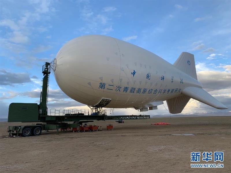 2019年5月30日在中科院青藏所纳木错多圈层综合观测站的观测营地拍摄的“极目一号”浮空器。新华社记者 田金文 摄