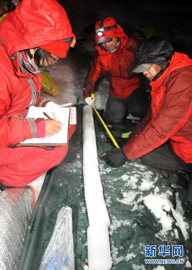 2017年7月1日,第二次青藏高原综合科考冰川与环境变化考察队前往龙匣宰陇巴冰川末端钻取冰芯。这是科考队员丈量、标记、装封冰芯。新华社发(索朗罗布 摄)