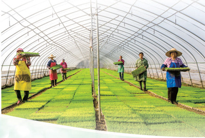 安徽肥东县牌坊乡禾丰农机合作社社员们在工厂化育秧大棚里培育、搬运水稻秧苗。 |