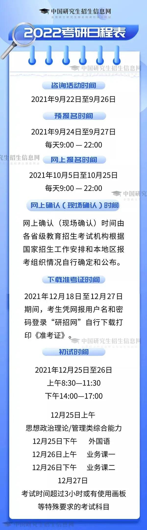 新华网北京9月23日电 根据《2022年全国硕士研究生招生工作管理规定》,2022年研考网上报名时间为2021年10月5日至10月25日。网上预报名时间为2021年9月24日至9月27日。