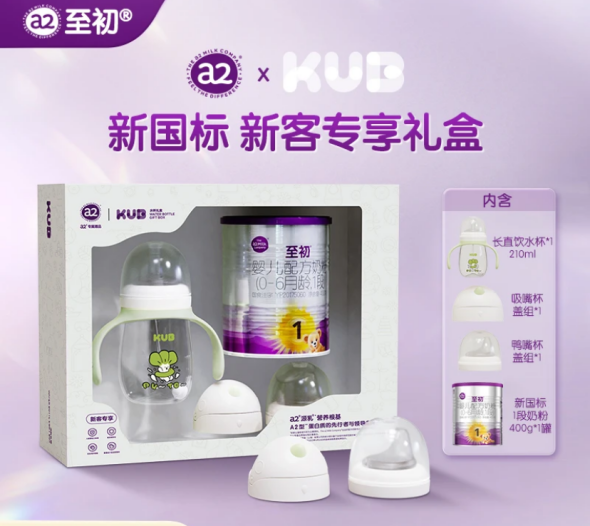 2023年,a2®至初®推出婴幼儿新国标奶粉,在多种营养成分的含量方面做了调整,让奶粉更高标准、营养配比更精准。2024年,基于对宝宝喂养科学化的目标一致性,KUB可优比与a2®携手合作,打造新客专享礼盒,共同守护宝宝新生。据了解,该系列礼盒已在a2®抖音旗舰店等上架,包括宝宝奶瓶、宝宝餐具、学饮杯、安抚玩具、干湿纸巾等多品类、多矩阵产品。