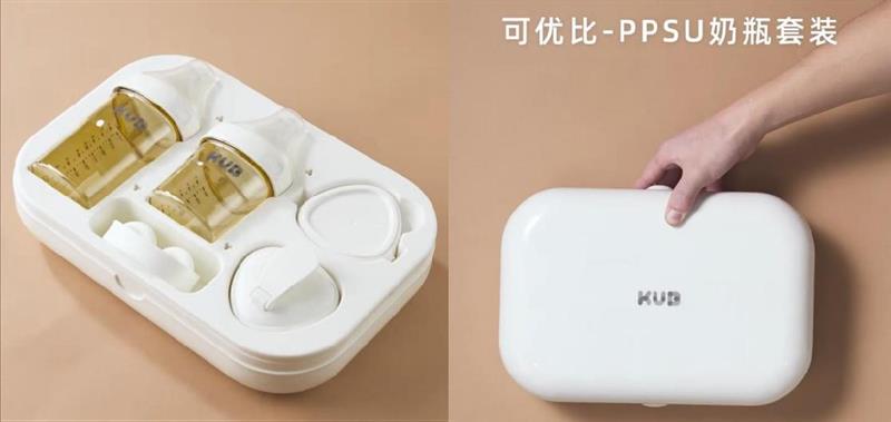 以宝宝奶瓶为例,KUB可优比PPSU奶瓶套组,包含150ml与240ml规格,满足宝宝不同阶段的奶量需求,将储存杯盖、奶嘴盖和喝水盖模块化组配,一瓶多用,收纳盒内配有沥水架,具备多场景、一站式的实用便捷性。
