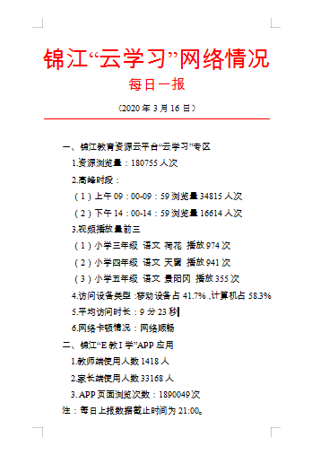 新冠疫情发生以来,锦江“云学习”模式,成为四川省“停课不停学”工作正面典型。5月29日,《 人民日报 》( 2020年05月29日 07 版)公布“科技战疫——2020中国数字化转型成功案例”,《锦江云学习服务全川学子停课不停学》入选教育服务类十大案例。