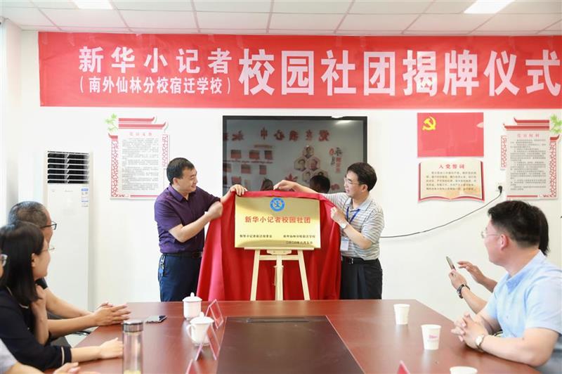 仪式上,南外仙林分校宿迁学校校长贺东亮与新华小记者(宿迁)家委会副主任刘军一起为小记者校园社团揭牌。