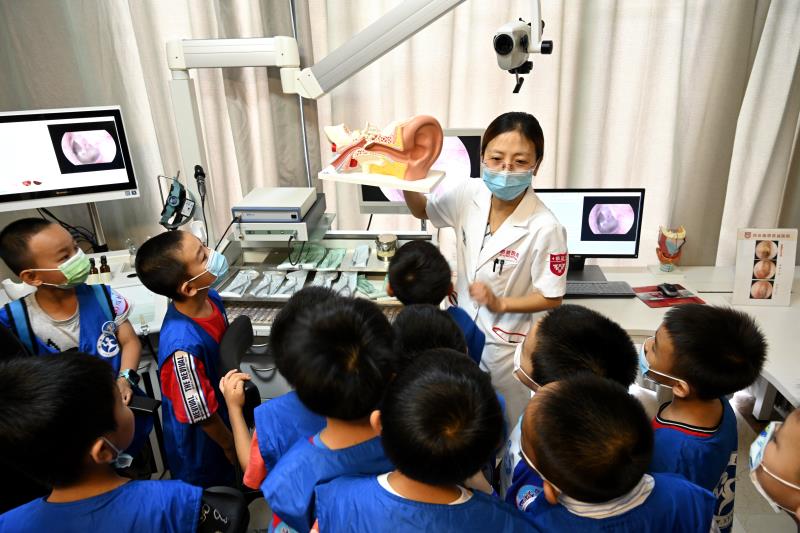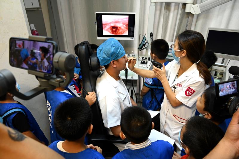 随后,小记者来到门诊诊室,参观了解世界顶尖的医疗设备,医护人员现场为小记者科普展示了鼻腔、耳部的内部够造,解答了小记者提出的耳鼻咽喉如何保护等问题,向小记者科普了耳鼻咽喉健康知识。