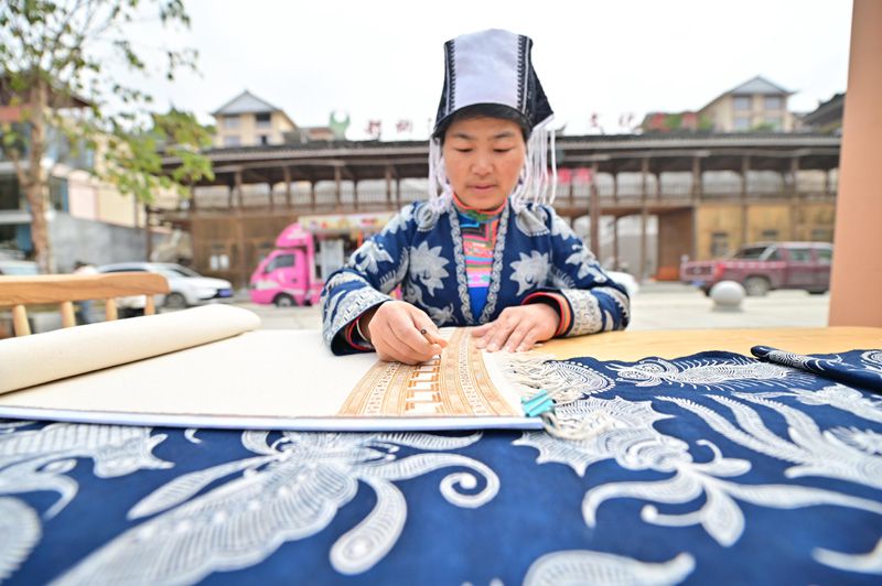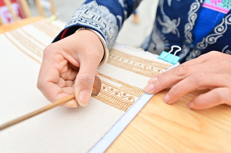 11月29日,蜡染艺人在贵州省从江县周末非遗扶贫集市上展示蜡染技艺。新华社发(吴德军 摄)