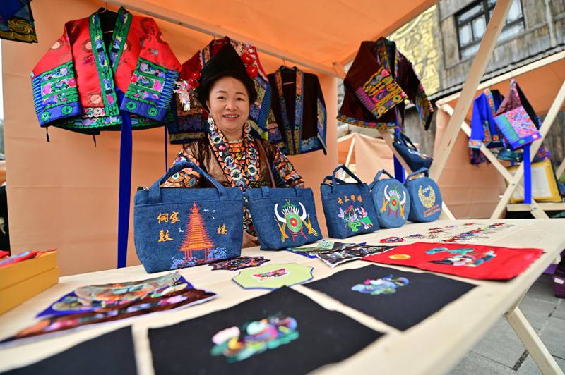 11月29日,刺绣艺人在贵州省从江县周末非遗扶贫集市上展销刺绣产品。新华社发(吴德军 摄)