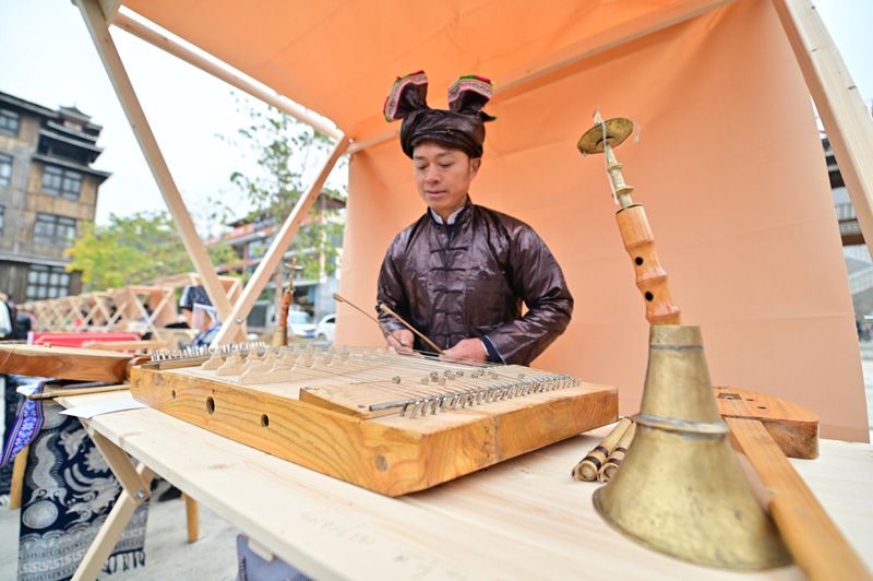 11月29日,侗琴制作艺人在贵州省从江县周末非遗扶贫集市上展示侗琴演奏。新华社发(吴德军 摄)